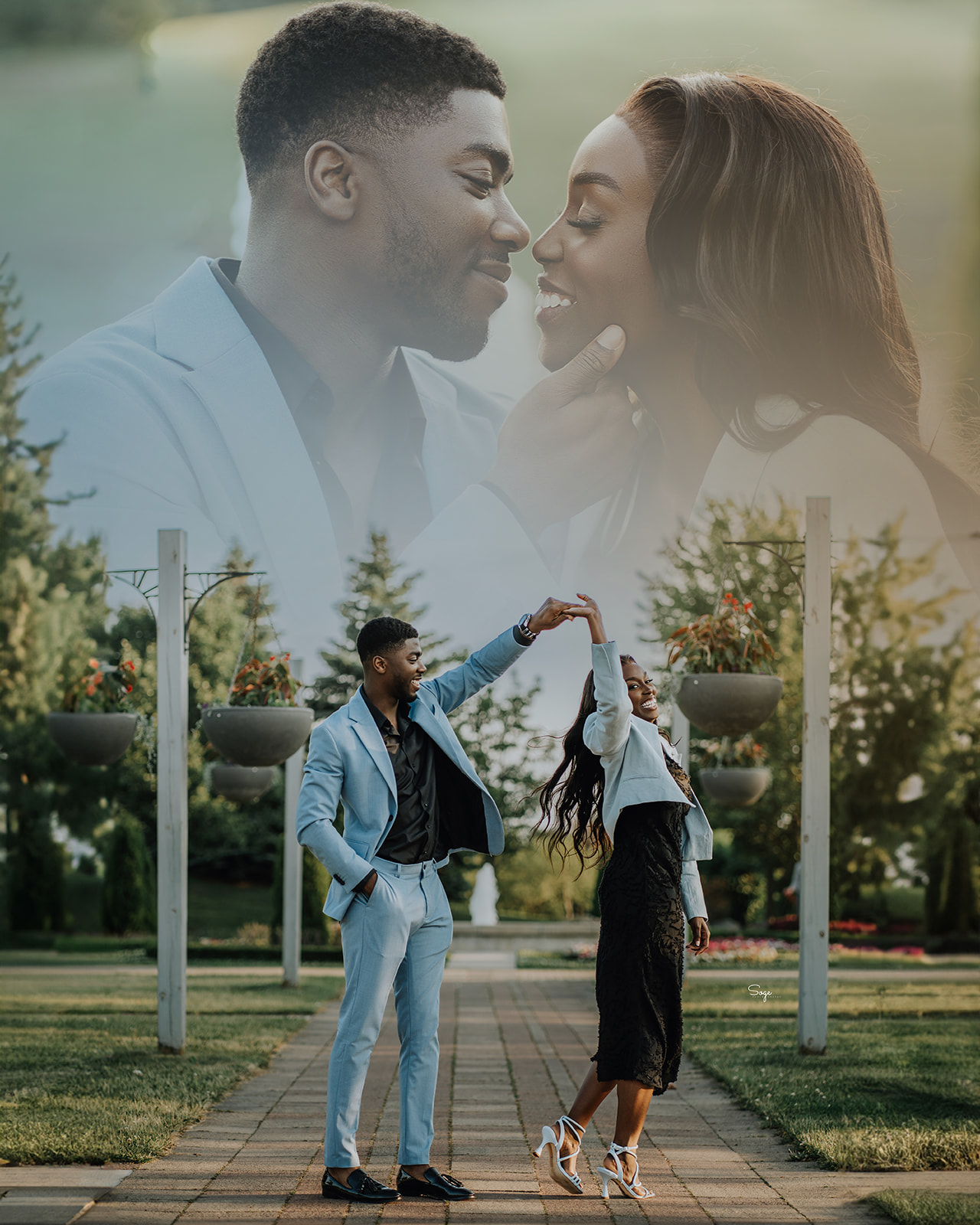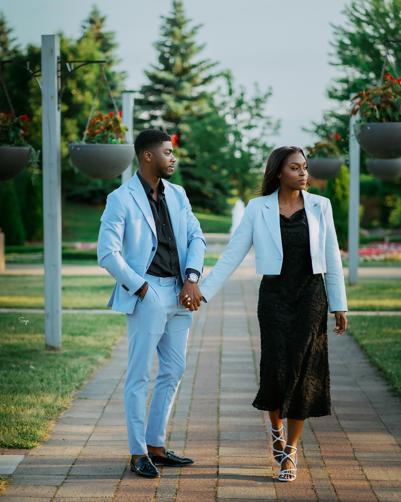 Bidemi and Victor brought two distinct looks to their session, each reflecting different facets of their relationship. Their first outfit showcased elegance he wore a tailored suit, she wore a sophisticated suit jacket. This polished styling photographed beautifully in the rose garden and against the heritage walkway’s architectural elements, creating timeless, classic portraits perfect for formal announcements.
